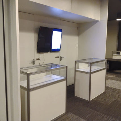 Balcões em Octanorm 1m x 50cm por 1,10m de altura.
